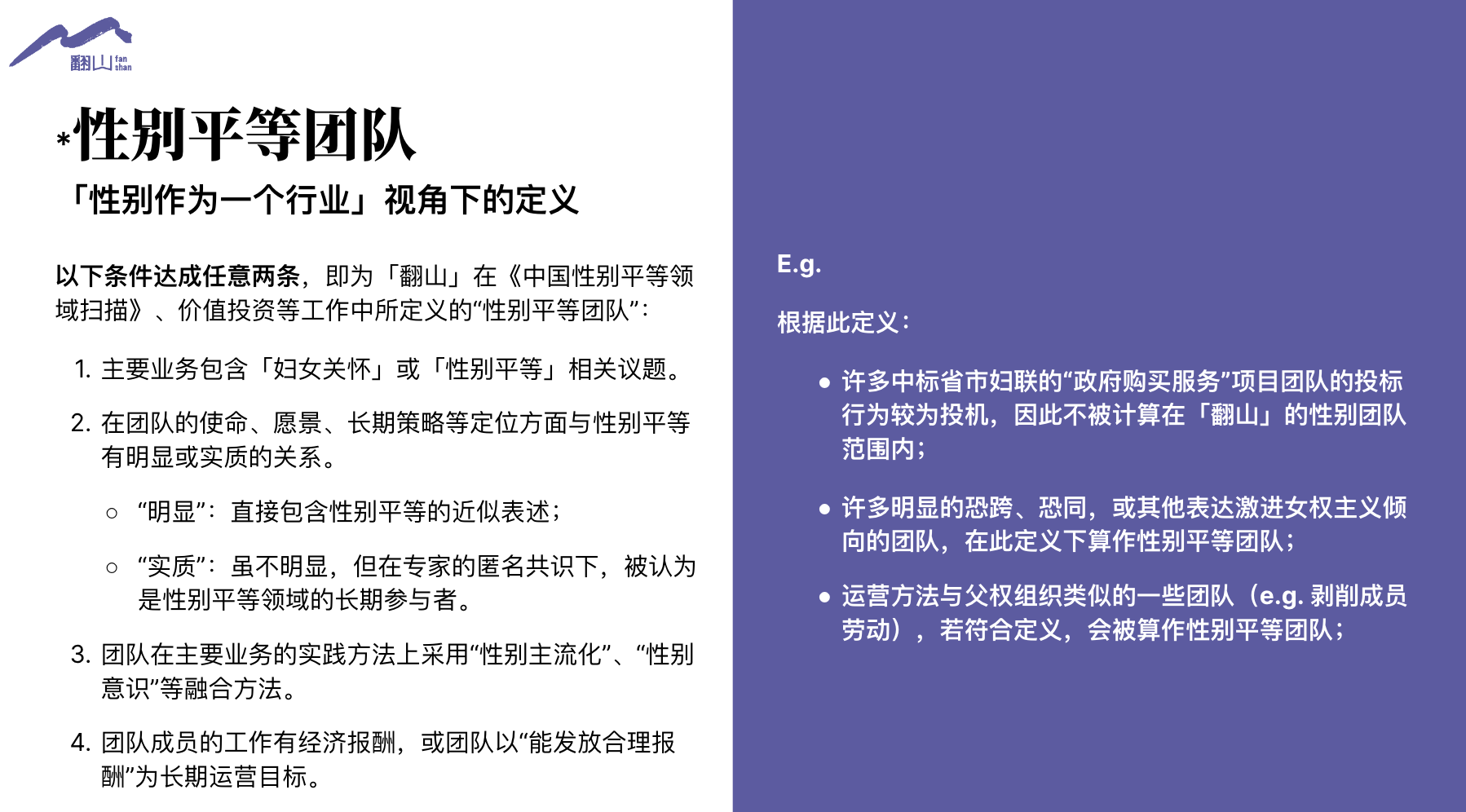 - 中国的「性别平等全职团队」总数量不超过120家*(+-15 误差,由「翻山」团队内部统计),其中大部分为非营利组织;