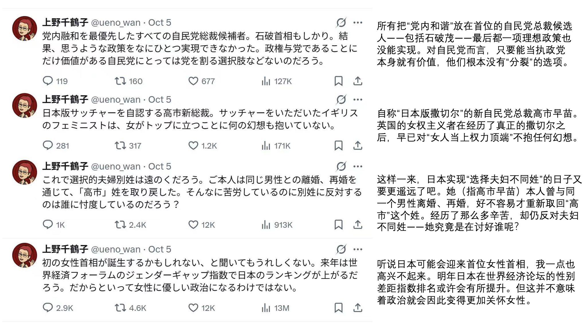 高市早苗在10月4日举行的自民党总裁选举中当选为该党第29任总裁,成为自民党首任女性总裁。根据日本政治传统,高市早苗仍需经过国会指名,才会成为日本首相。指名的临时国会将于10月15日召开,届时她将可能被指名为第104任首相。日本将迎来首名女性首相。在日本这样一个在方方面面都相对保守的国家,这无疑是一次突破。但是这似乎对于日本的女权主义者来说似乎并不是一个好消息。日本知名女权主义学者上野千鹤子10月5日在X平台连发4条帖子,表达了对于高市当选的不满。上野直言:“听说日本可能会诞生首名女性首相,但我一点也高兴不起来。”
